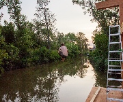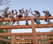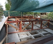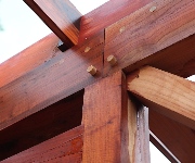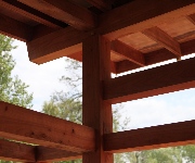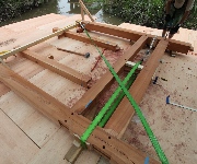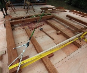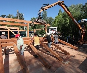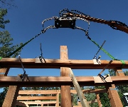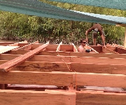 Luego de preparar todas las vigas y columnas de la casa, creando cada una de las cajas y espigas. La estructura se armó y se subió. Subimos las paredes por etapas utilizando una grua que nos iba ayudando a levantar cada seccion ya que eran bien pesadas. Una vez levantadas las fuimos uniendo para consolidar la estructura en un solo bloque.